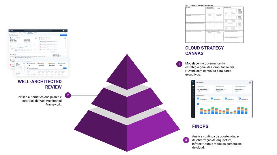 Definição e acompanhamento de objetivos estratégicos, de tecnologia, well-architected compliance e FinOps.